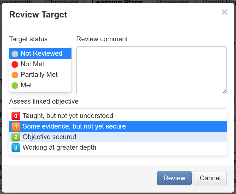 If the target has a linked objective, you will also have the option to assess it, independently of the overall Target status. For example, you might want to indicate that the learning plan target has been met, but the pupil is now working at greater depth against the objective.
